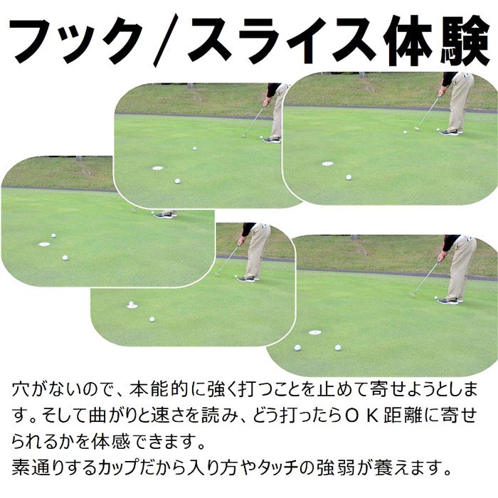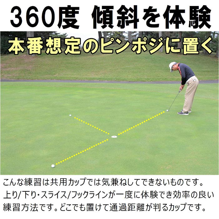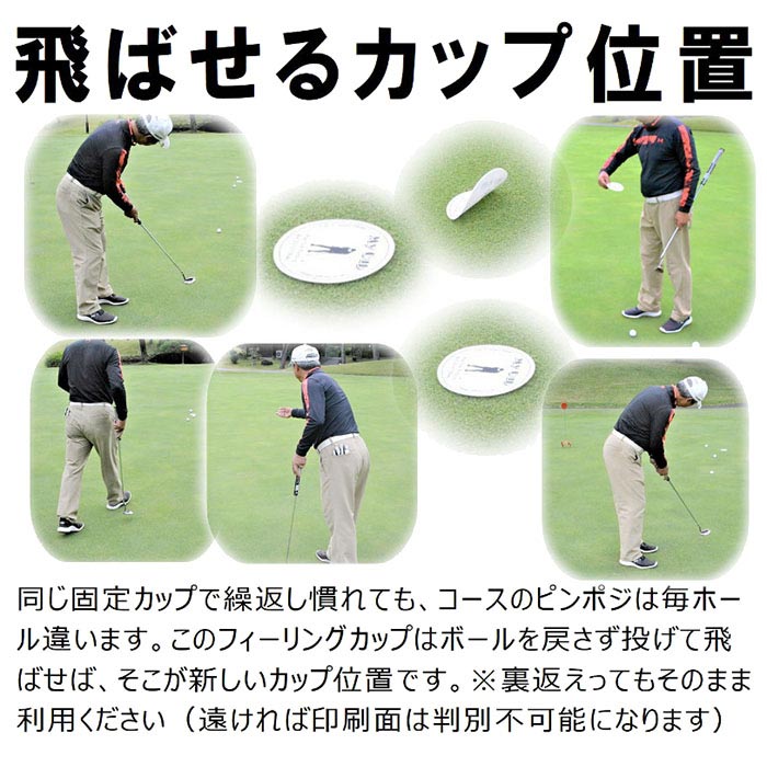 Q.コースはカップなのに、なぜ練習はカップに入れない方がいいのですか? A.練習では自分の好きな場所から打てますが、コースでは入りやすい所にボールを運べる人は少ないのではないでしょうか? 本番を想定した場所にこのカップを置くとしたら、未知の位置だから難しすぎて本能的に入れてやろうという気が起きなくなります。 どこに向かって力加減はどうしようと考えを巡らし、最終的にどこに止めるかが目標になると、パット数が激減します。