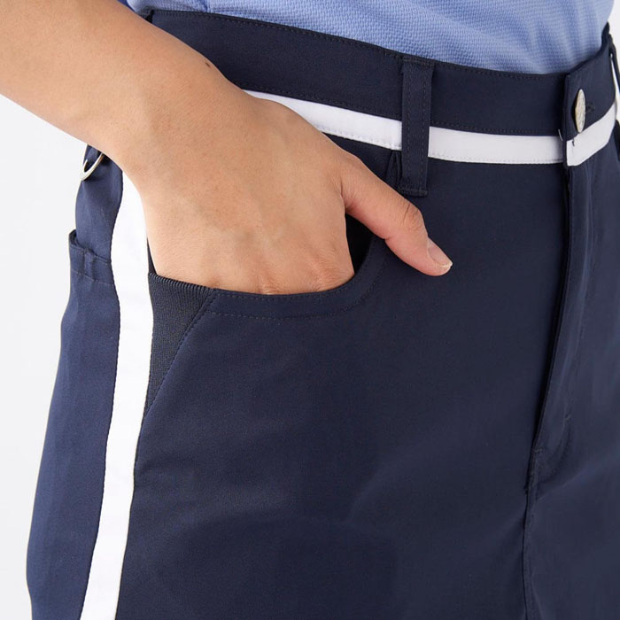 特長 定番で使いやすいストレッチスカート。サイドラインがアクセントとして施されており、スポーティーながらも洗練されたデザインが特徴です。適度な丈感で動きやすく、ゴルフのスイングや歩行を妨げません。ストレッチ性に富んだ吸水撥水素材を使用しており巾広いコーデに活躍するシンプルな台形スカートです。インナーパンツがセットになっているのも嬉しいポイント。※スカート以外は商品に含まれません。