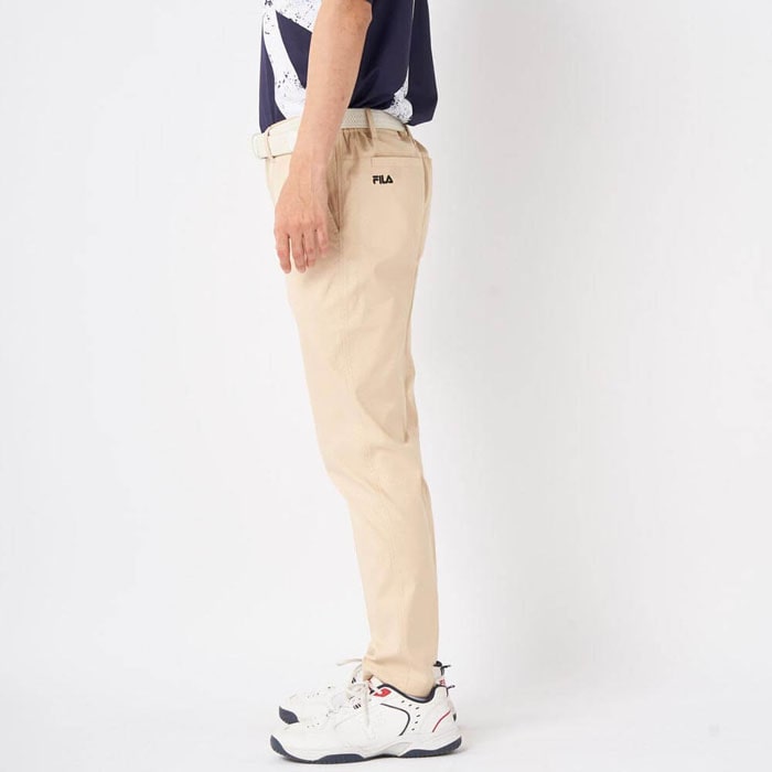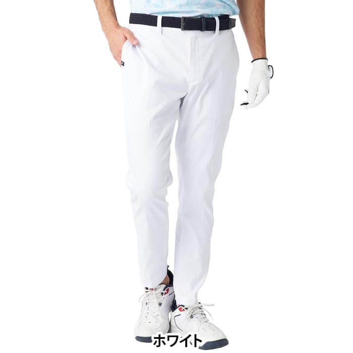 特長 ストレッチの効いた軽量ツイル素材にエンボスプリント加工をしたパンツ。シンプルながらも細かな柄が施されたゴルフパンツで、上品で洗練された印象を演出します。どんなトップスとも合わせやすく、ゴルフシーンだけでなく、タウンユースとしても活躍する万能な一着です。撥水コーティング加工で雨をしっかりガード。裾上げいらずの9分丈仕様で、細身のテーパードシルエットです。シルエットは細身でありながら、適度なゆとりを持たせたテーパードデザインを採用。脚長効果も期待でき、スマートな印象を与えます。・UVカット・吸汗速乾・ストレッチ※パンツ以外は商品に含まれません。