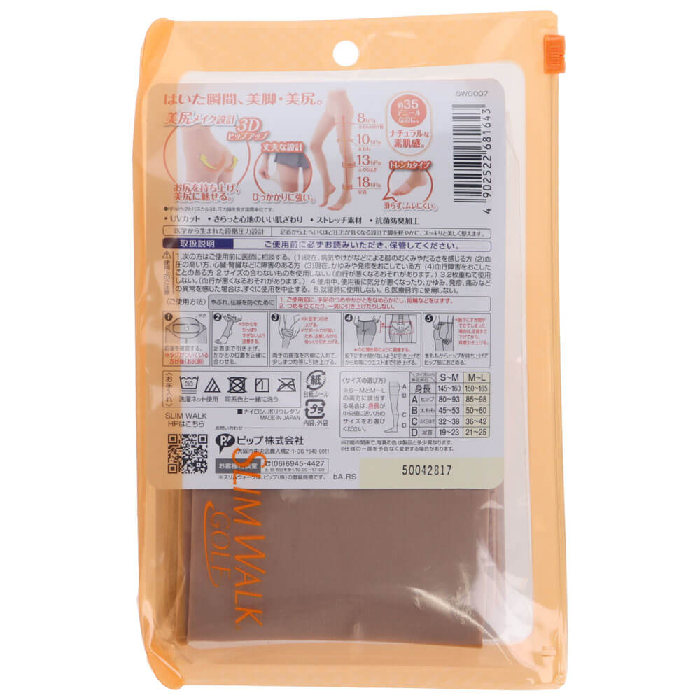 「スリムウォーク ゴルフ 美脚&美尻ストッキング 」の特長 ・美脚&美尻ストッキング 着圧レッグウェア「スリムウォーク」から登場♪ゴルフ中の美脚ケアシリーズ「スリムウォーク ゴルフ」のストッキングです。 ・360度ぐるっと美脚ラインへ ゴルフで疲れやすい脚を軽やかに、美しく、ひきしめます。 ・段階圧力設計 足首から上へいくほど圧力が低くなる「段階圧力設計」を採用。 ※足首18hPa、ふくらはぎ13hPa、太もも10hPa、太ももの付け根8hPa ・美尻メイク設計 3Dヒップアップ!美尻メイク設計で、たるんだお尻をキュッと持ち上げます。 ・ナチュラルな素肌感 丈夫な設計で引っかかりに強いストッキングです。 約35デニールなのに、ナチュラルな素肌感。 ・トレンカタイプ 足先を覆わないトレンカタイプで、滑らずにムレにくくなっています。 ・嬉しい機能はほかにも♪ UVカット・抗菌防臭加工・オールシーズン着用可能など、他にもゴルフを楽しむ方に嬉しい機能たくさん! ・パッケージ スライダーポーチ型のパッケージです。