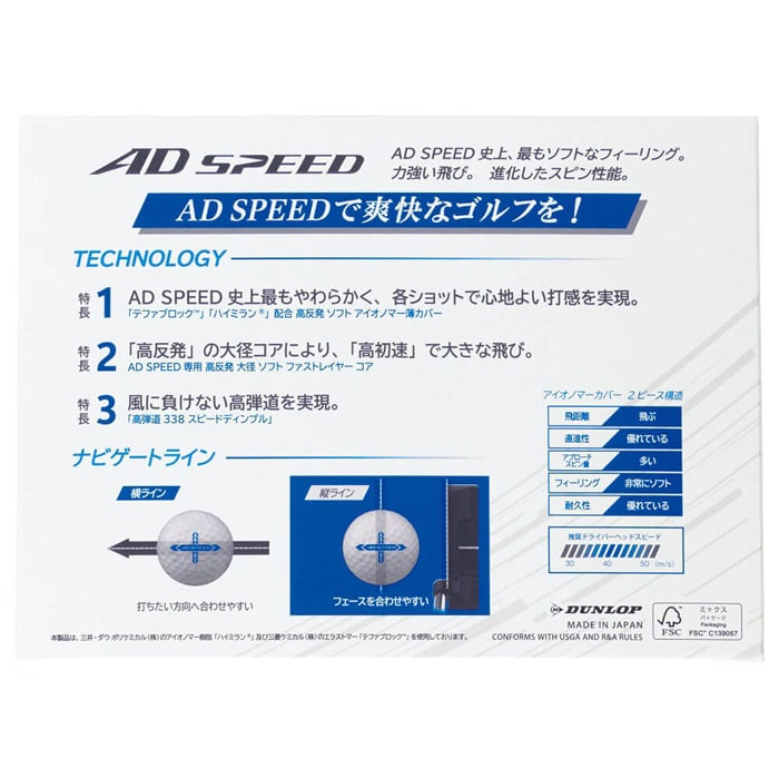 ソフトな打感と力強い飛び、優れたアプローチ性能で爽快なゴルフを 飛距離性能だけでなくアプローチスピン性能、ソフトな打感を求めるゴルファーにおすすめ。 「スリクソン AD SPEED」は「高反発大径ソフトファストレイヤーコア」を搭載し、高初速、高打ち出し、低スピンによる大きな飛びと テファブロック、ハイミラン配合「高反発ソフトアイオノマー薄カバー」で、すべてのショットで心地よいソフトな打感とアプローチスピン性能を発揮します。