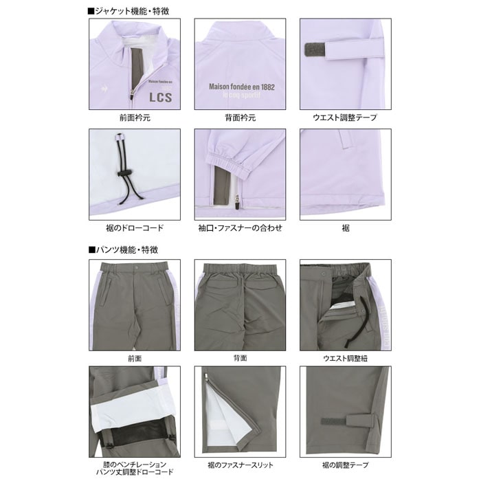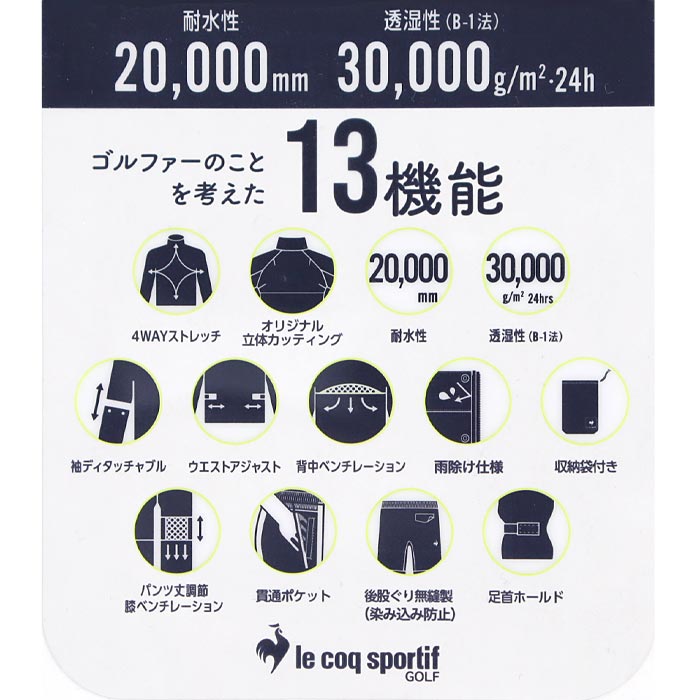 特長 軽量性を重視した新素材2.5層ナイロンラミネート素材は裏地が無くても肌にまとわりつきにくく、しなやかでストレッチ性にも優れます。耐水性20,000mm、透湿性(B-1法)が30,000g/mm・24hrs。袖ディタッチャブルやベンチレーション、ウエストの絞りや股下調整など基本仕様は変更せず、機能性がさらに高まりました。鮮やかなカラーリングで雨の日が楽しみになるようなレインウェアです。表地裏面にポリウレタン樹脂加工しています。■着脱可能■耐水■透湿■ストレッチ