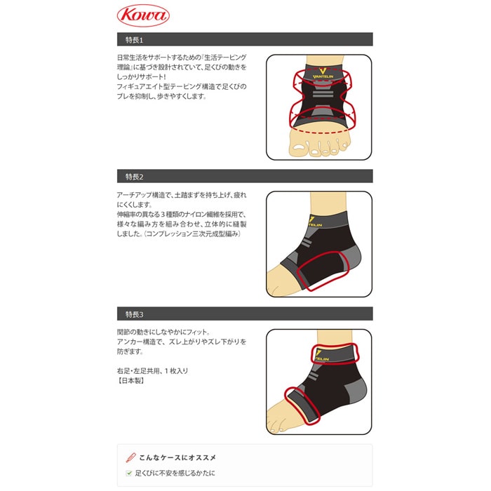 特許技術のテーピング構造でしっかりサポート! 【テーピング機能付進化形サポーター】 テーピング理論に基づいて設計・製造された特殊テーピング編みが、日常の中で感じる関節の不安を軽減 特長1.フィギュアエイト型テーピング構造 フィギュアエイト構造を採用することで、足くびのブレを抑制し、歩きやすくなります。 特長2.アーチアップ構造 土踏まずを持ち上げることで、足の動きがスムーズになり、疲れにくく、歩きやすくなります。 特長3.機能を安定させるアンカー構造 上下のアンカーが、適度な締め付けでサポーターのズレ上がり、ズレ下がりを防ぎ、フィギュアエイトやアーチアップ機能を安定させます。 【LYCRA】 ライクラ 快適ストレッチ繊維、ライクラ、ファイバーを使用しています。 ※ライクラ(LYCRA)はインビスタ社の商標です。 ◆日本製 ◆右足・左足共用、1枚入り