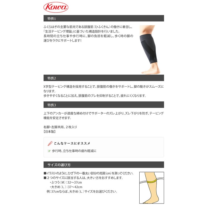 バンテリン コーワ サポーター 『ふくらはぎアシスト』 特殊技術のテーピング構造でしっかりサポート! 【テーピング機能付進化形サポーター】 テーピング理論により、腓腹筋の過度なブレを抑制して脚の負担を軽減し、歩く時の脚の運びをラクにサポート! 特長1.X字型テーピング構造 ・X字型構造を採用することで、腓腹筋の働きをサポートし、脚の動きがスムーズになります。 ・歩きやすくなることに加え、腓腹筋のブレを抑制することで、疲れにくくなります。 特長2.機能を安定させるアンカー構造 上下のアンカーが、適度な締め付けでサポーターのズレ上がり、ズレ下がりを防ぎ、テーピング機能を安定させます。 【LYCRA】 ライクラ 快適ストレッチ繊維、ライクラ、ファイバーを使用しています。 ※ライクラ(LYCRA)はインビスタ社の商標です。 ◆日本製 ◆右脚・左脚共用、2枚入り