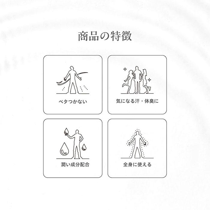 さっぱりさらさらクールダウン ラウンド後のほてった身体を爽快クールダウン。パウダーインで汗のベタつきもさっぱりさらさらに。 手に適量とり、肌におしつけるようになじませてください。