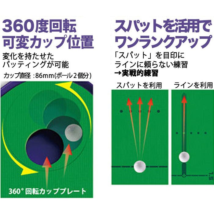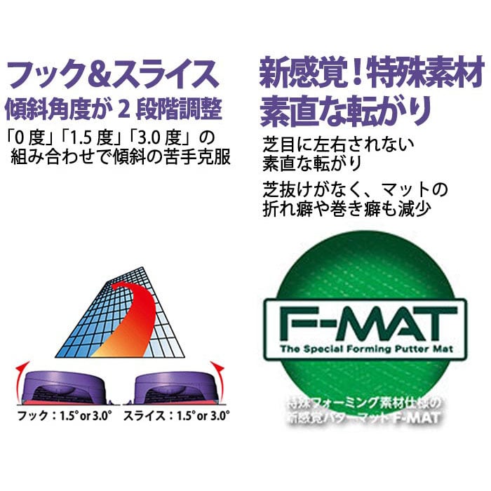 藤田寛之プロと株式会社タバタとの共同開発 第3弾「Fujita マット U-2.3」 藤田寛之プロ直伝!傾斜を制するパターマット ●フック&スライス 2段階調整できる傾斜角度を組み合わせて苦手を克服 使い方やラインの設定も簡単で、パターマットのベース側になる「スペーサー」で、フック、スライスの傾斜角度をワンタッチで変更可能。 転がしたボールの重みなどで、マット面が動いたりすることなく安定した設計になっている。 傾斜の角度については藤田寛之プロの度重なる監修のもと最適な角度に設計され、左右に「緩やかな1.5度」「きつい3.0度」の2段階づつを配置。 「ストレート」「フック1.5度」「フック3.0度」「スライス1.5度」「スライス3.0度」計5種類のラインが練習可能。 ●新感覚!特殊素材「フォーミングマット」で素直な転がり 一般的なパターマットでは当たり前になっている「人工芝」を採用せず、いままでにないほどの新感覚「フォーミングマット」を採用。 ボールの転がりが人工的な芝目に左右されず、自然な軌道を描きます。 特殊フォーミング素材のソフトな感覚が実戦的でスムーズな転がりと、打ち出し感を再現。 特に、人工芝の欠点である、折れ癖・巻き癖・人工芝の不自然な順目逆目・芝糸の抜けなどがなくメンテナンス性に優れています。 ●スパット活用でワンランクアップ 「スパット」を目印にしてラインに頼らない実践的な練習が可能。 ただし、基本となるストレートの練習も可能なようにストレートラインも実装しています。 ●360度回転!可変カップ位置 藤田寛之プロのパターテクニックを反映させるため、360度回転式のカッププレートを採用。 任意の位置が設定できる為、変化を持たせたパッティングが可能。 (カップ直径:86mm ※ボール2個分)