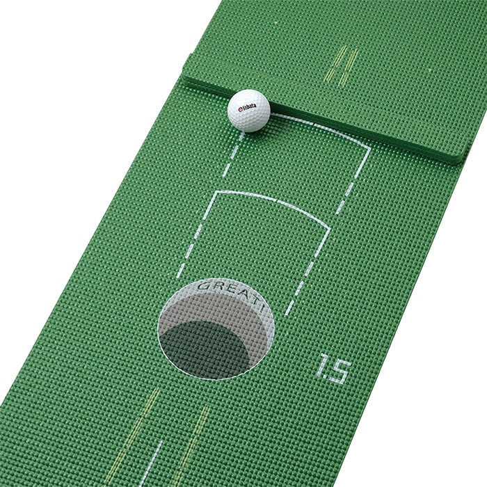 日々の練習で距離感GET! フラットタイプのパターマット 芝抜けの心配がないフォーミング仕様 いつでも手軽に敷いて練習できます。 立体的に見える「リアルカップデザイン」を採用 自由に配置できるストッパー付きで、目的に合わせた練習が可能! ボールストッパーを使用して、スティンプ値約10フィート相当の距離感の練習ができます。 付属品:ボールストッパー3個入り(厚み:12mm×1個、6mm×2個)