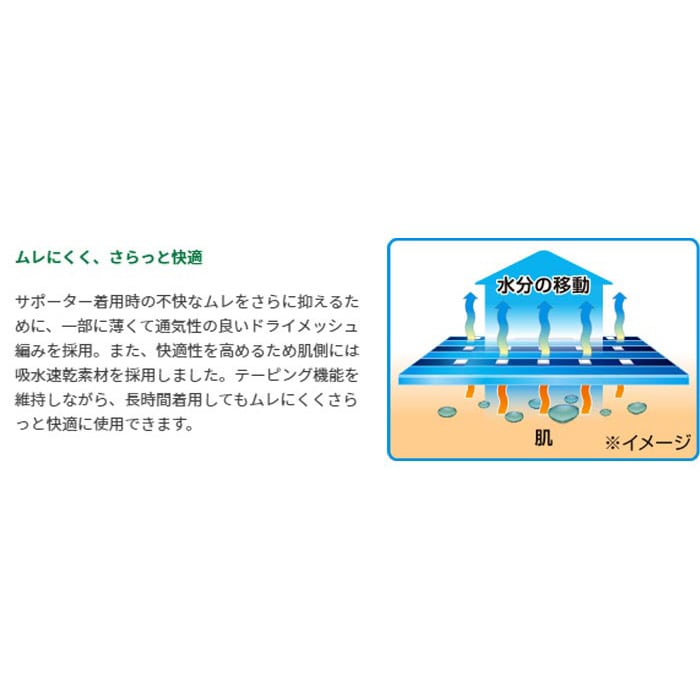 長時間着用してもムレにくく、サラッと快適に使用できる ●テーピング機能付、進化形高通気サポーター ●日本製 ●1枚入り(右脚・左脚共用)