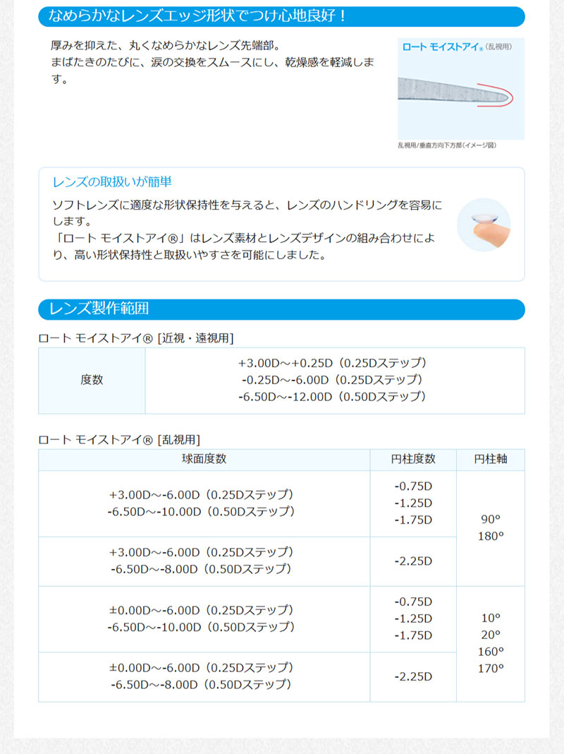 | 乱視度数 | -0.75,-1.25,-1.75,-2.25(SPH-8.00まで) |