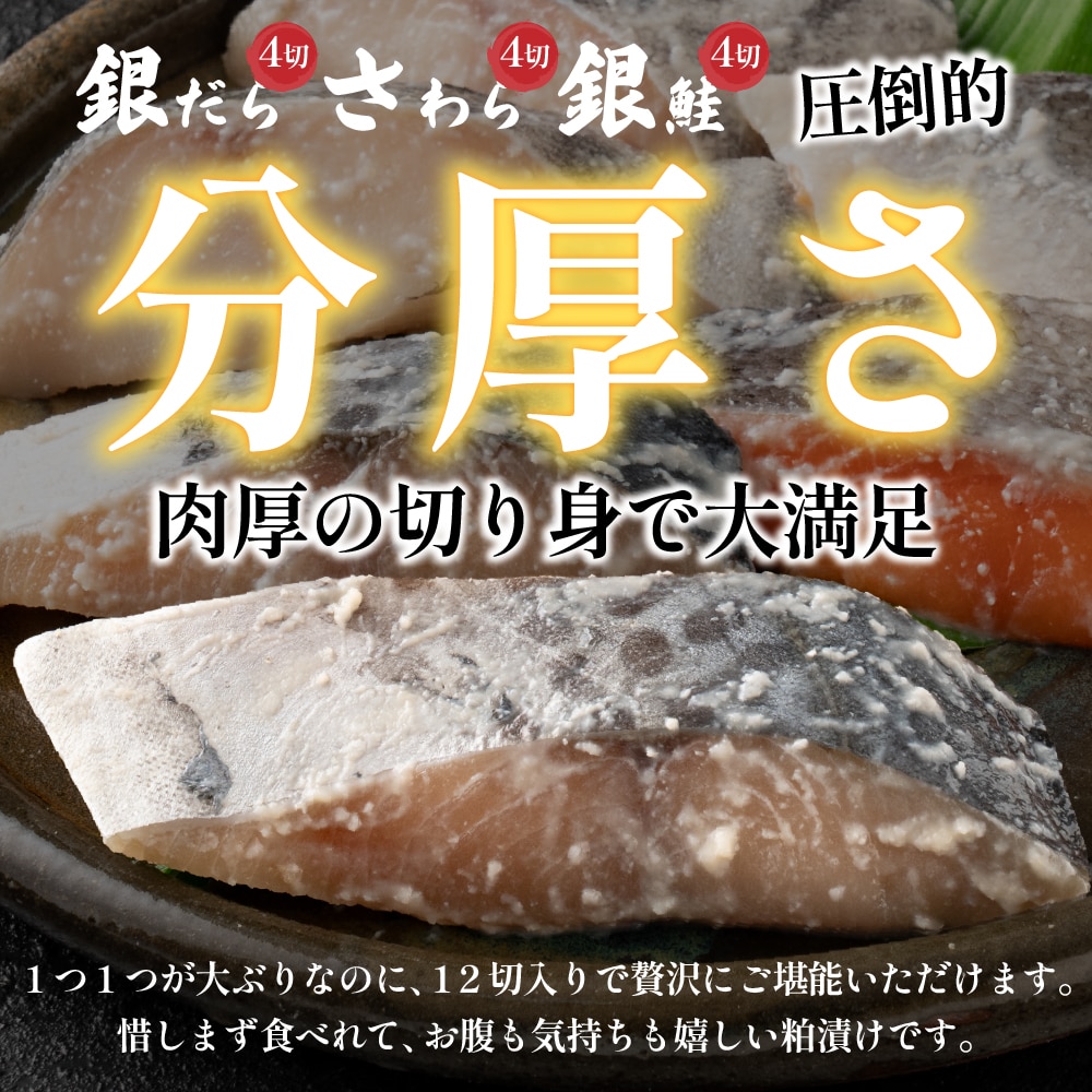 【原材料名】 《銀だら酒粕漬け》 鰆(韓国)、酒粕、酒、味醂、砂糖、西京味噌、白味噌、塩、薄口醤油/調味料(アミノ酸等) 《さわら酒粕漬け》 銀だら(米国)、酒粕、酒、味醂、砂糖、西京味噌、白味噌、塩、薄口醤油/調味料(アミノ酸等) 《銀さけ酒粕漬け》 銀鮭(台湾)、酒粕、酒、味醂、砂糖、西京味噌、白味噌、塩、薄口醤油/調味料アミノ酸等) 本商品に使用しているアレルゲン(特定原材料および準ずるもの):サケ・小麦・大豆 【内容量】 3種 各2袋(6袋入り)1袋2切れ入り(1切れ当たり約80g) 【栄養成分表示(100g当たり)】 《銀だら酒粕漬け》 エネルギー 224kcal たんぱく質 11.1g 脂質 14.5g 炭水化物 12.2g 食塩相当量 1.5g 《さわら酒粕漬け》 エネルギー 136kcal たんぱく質 18.1g 脂質 3.6g 炭水化物 8.3g 食塩相当量 1.5g 《銀さけ酒粕漬け》 エネルギー 124kcal たんぱく質 18.6g 脂質 3.4g 炭水化物 8.3g 食塩相当量 1.5g ※この表示値は、目安です。 【賞味期限】 -18℃以下保管で製造日より3ヶ月、解凍後10℃以下で3日 (詳細は商品に別途記載) 【保存方法】 要冷凍(-18℃以下) 【ご注意 賞味期限は未開封で 18℃以下にて保存した場合の期限です。 解凍、開封後はお早めにお召し上がりください。 一度解けたものを再び凍らせますと、品質が変わることがありますので再凍結はお止めください。 【配送方法】 冷凍便配送 【製造者】 合同会社海鮮亭いっき静岡県掛川市城下6-16 【販売者】 株式会社 雑穀米本舗 住所:静岡県静岡市葵区羽鳥本町11-11 TEL:054-278-8160