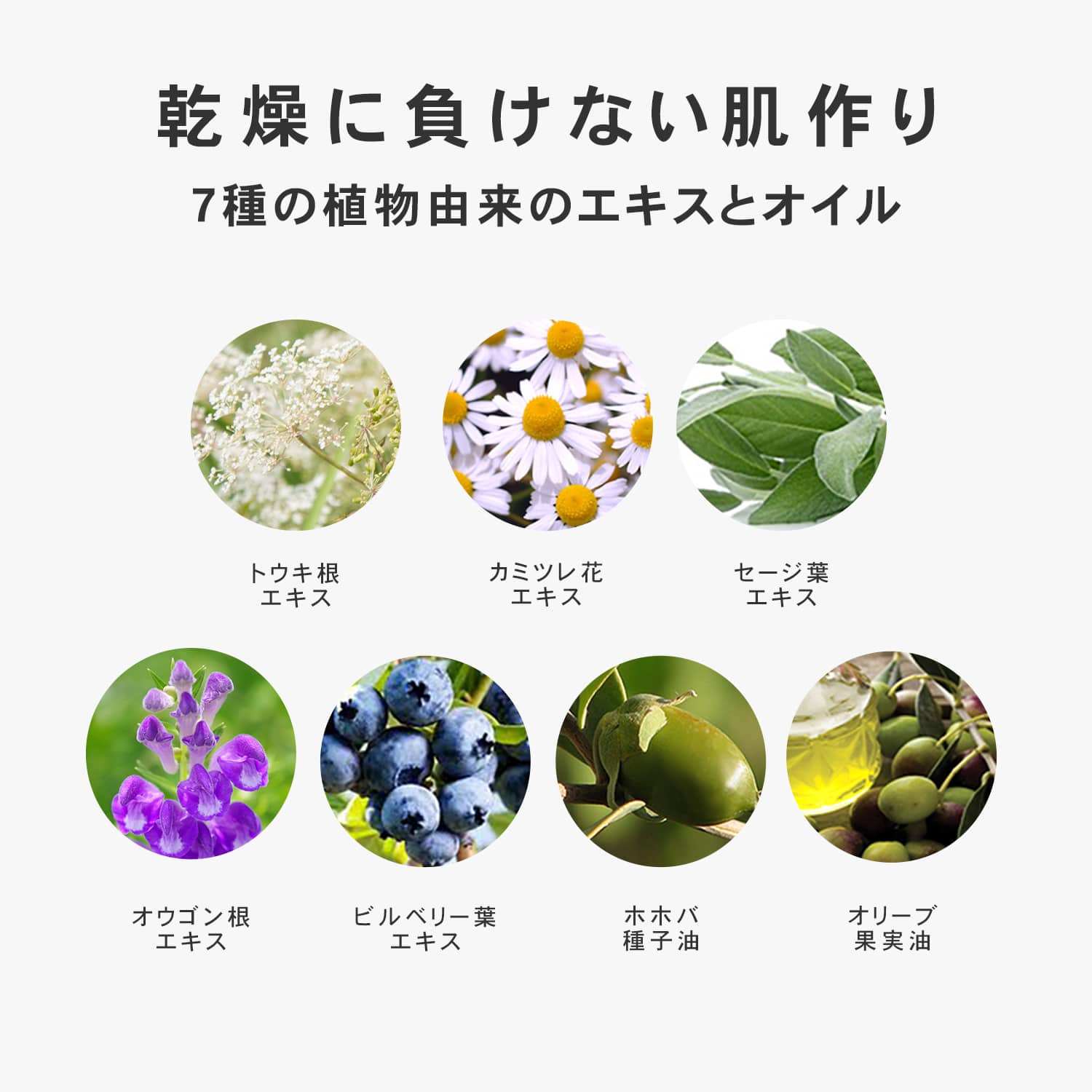 水、DPG、BG、セバシン酸ジイソプロピル、ヒドロキシステアリン酸エチルヘキシル、二酸化炭素、セラミドNG、コメ発酵液、乳酸桿菌/ブドウ果汁発酵液、グルコノバクター/ハチミツ発酵液、ガラクトミセス/オリーブ葉発酵エキス、シアノコバラミン、グリチルリチン酸2K、アルギニン、トウキ根エキス、カミツレ花エキス、セージ葉エキス、オウゴン根エキス、ビルベリー葉エキス、グレープフルーツ果皮油、ホホバ種子油、オリーブ果実油、エチルヘキシルグリセリン、PPG-4セテス-20、メチルプロパンジオール、ジメチコン、ポリソルベート60、ペンタステアリン酸ポリグリセリル-10、ステアロイルラクチレートNa、カルボマー、カプリルヒドロキサム酸、EDTA-2Na、フェノキシエタノール、ベヘニルアルコール