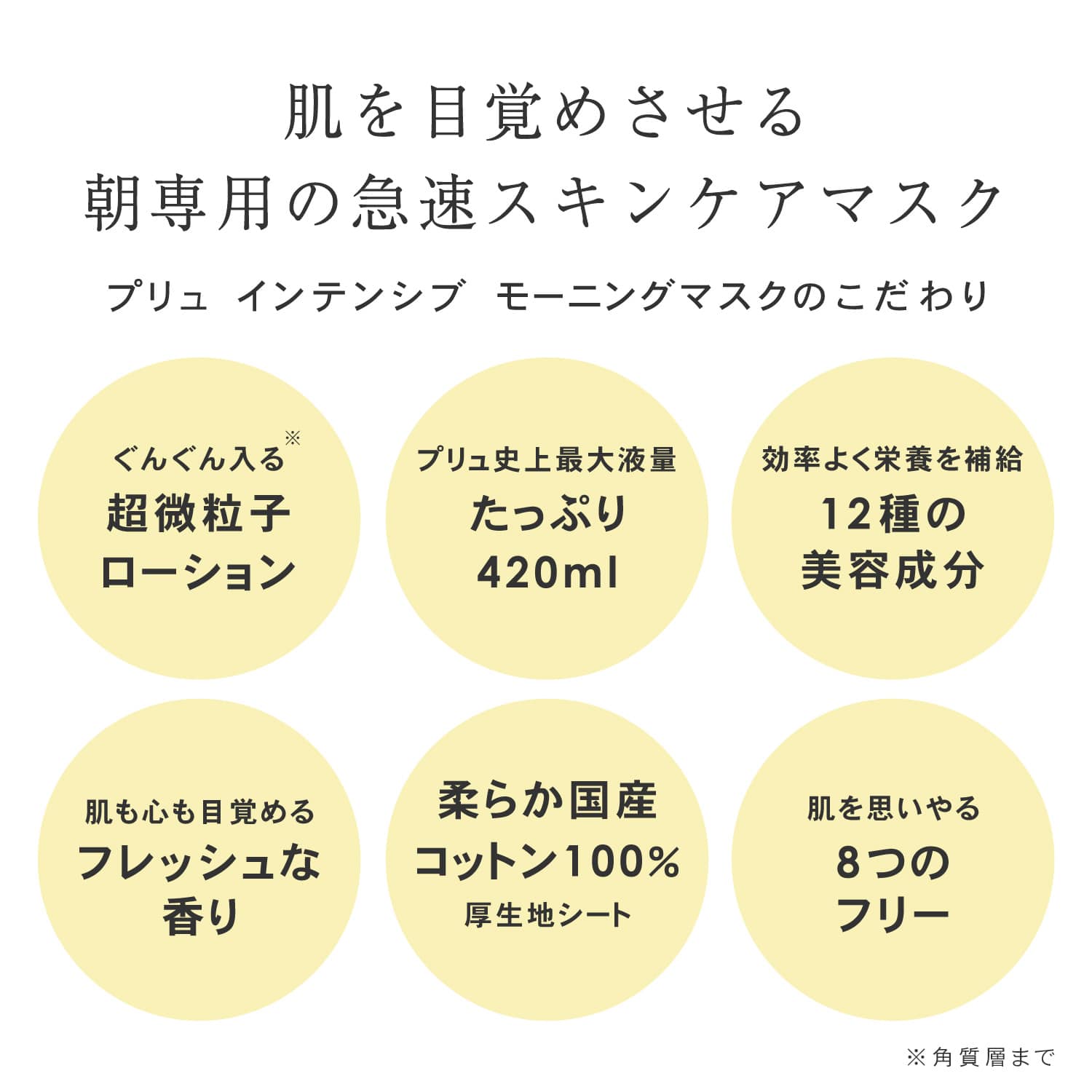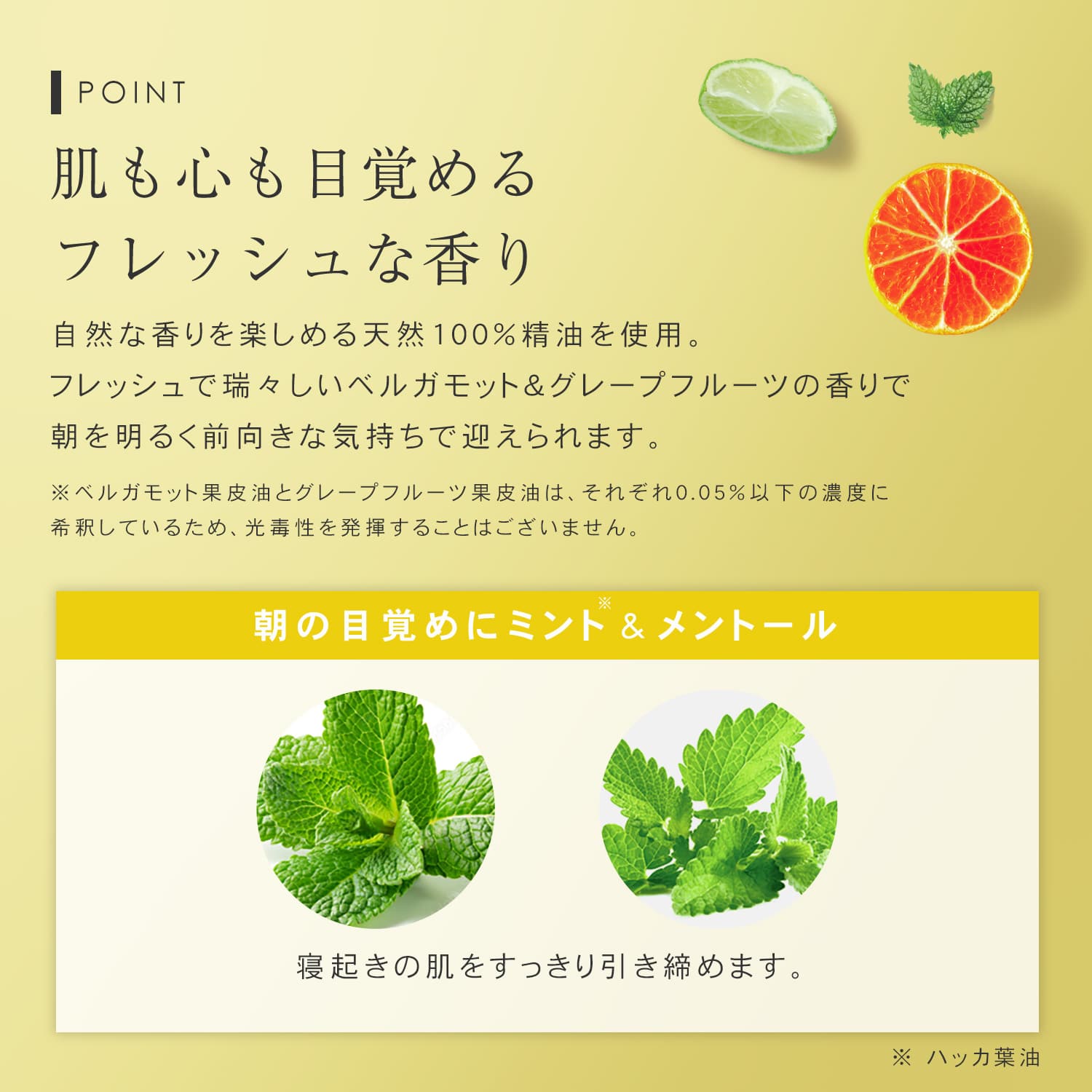 朝の急速60秒スキンケアパック!「保湿」「保護」「整肌」成分をバランスよく配合し、天然100%精油の清涼感のある香りが気持ちをリフレッシュさせ、寝起きの肌を引き締めてくれます。大容量30枚入。
