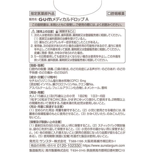 1粒ずつ2粒までを口中に含み、かまずにゆっくり溶かして使用する。2時間以上の間隔をおいて使用する。5歳未満の乳幼児は使用しないこと。