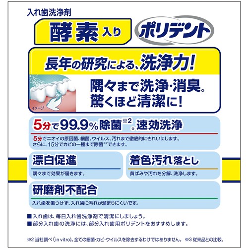※1 当社調べ(in vitro)。全ての細菌・カビ・ウイルスを除去するわけではありません。※2 従来品との比較※3 義歯洗浄剤内。当社が第三者調査機関へ委託し、歯科医師サンプル200名へ2024年6月に実施した定量調査に基づく。※4 対象: 部分入れ歯用洗浄剤。日本歯科医師会の推薦は、本製品の品質・性能を保証するものではありません。また製造・販売当に関与するものではありません。
