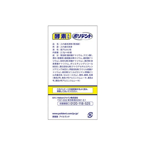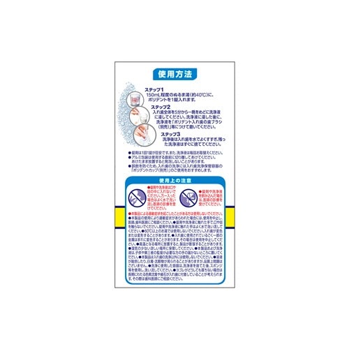 ・洗浄後は入れ歯を水でよくすすぎ、残った洗浄液はすぐに捨ててください。・錠剤は1回1錠が目安です。また、洗浄液は毎回お取替えください。・アルミ包装は使用する直前に切り離してあけてください。あけたまま放置すると発泡しないことがあります。・誤飲を防ぐため、入れ歯の洗浄には入れ歯洗浄保管容器の「ポリデントカップ(別売)」のご使用をおすすめします。