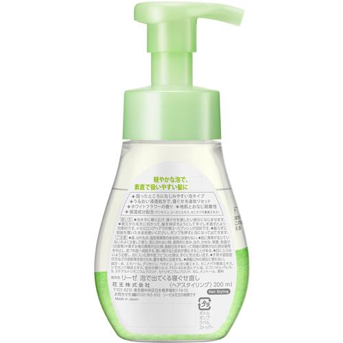 【商品特徴】気になる寝ぐせになじませやすい泡タイプ。手ぐしだけで寝ぐせ直し完了! ■軽やかな泡で、重くならずナチュラルな髪に 内側の髪まで泡がすんなり浸透 ■うるおい浸透処方で、すばやく寝ぐせをリセット ■ホワイトフラワ-の香り ■保湿成分配合 (グリセリン、ユ-カリエキス、ノバラエキス*) ■その他の商品説明:地肌とおなじ弱酸性 *カニナバラ果実エキス 【商品詳細】 ●幅 :74 ●高さ:162 ●奥行:57 ●重量: ●内容量(個数・容量):200ml ●カラ-: ●成分・原材料:水、エタノ-ル、グリセリン、ベタイン、ユ-カリ葉エキス、カニナバラ果実エキス、シラカンバ樹皮エキス、加水分解シルク、PEG-60水添ヒマシ油、(C12-14)s-パレス-9、ステアルトリモニウムクロリド、セトリモニウムクロリド、BG、メント-ル、香料 ●区分:ヘアスタイリング ●原産国: 日本 ●JANコ-ド:4901301316882