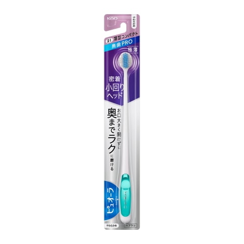 ◆花王史上最薄級2.5mmの「極薄ヘッド」とピュオ-ラ独自の「密着ウェ-ブカット」「密着先細毛」が、磨きにくい奥歯の奥、歯と歯ぐきのキワ、歯と歯のすき間の3大難所を攻略。