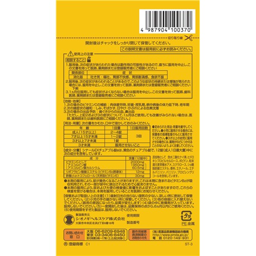 シナ-ルEXチュアブル錠eは、ビタミンCの補給に適したビタミン剤で、口の中で溶かすか、水なしでかみくだいてのめるチュアブル錠です。またビタミンCとともに抗酸化作用をもつ天然型ビタミンE、皮ふの正常な働きをサポ-トするビタミンB2を配合しています。