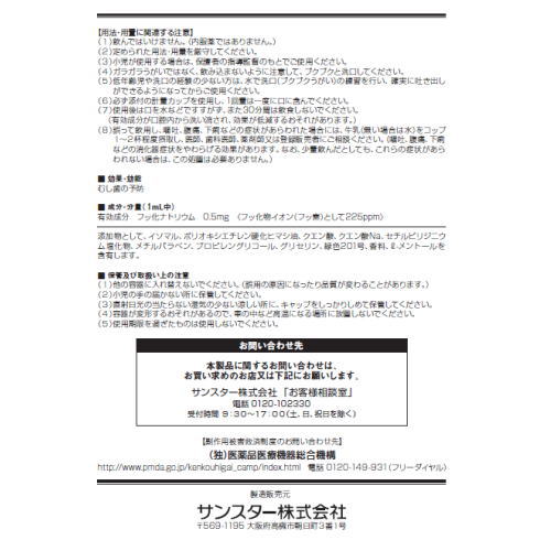 フッ化ナトリウム(フッ化物イオン(フッ素)として225ppm)・・・0.5mg