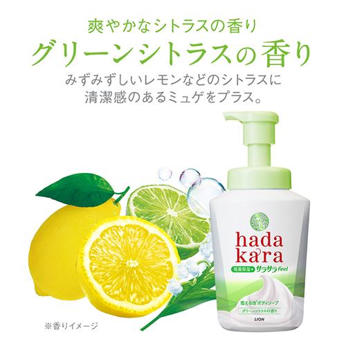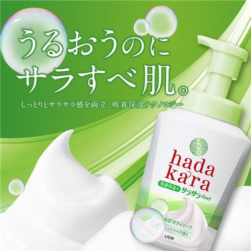 ●1プッシュでキメの細かい濃密泡が出てくるハダカラ「増える泡ボディソープ」のサラサラfeelタイプ。