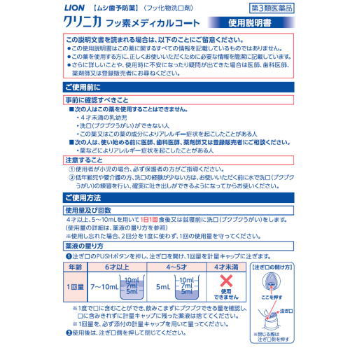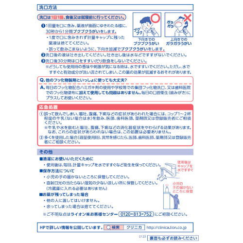 (5)低年齢児や要介護の方、洗口の経験の少ない方は、水で洗口(ブクブクうがい)の練習を行い、確実に吐き出せることを確認してからご使用ください。