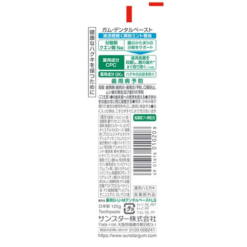 薬用成分:フッ化ナトリウム(フッ素)、塩化セチルピリジニウム(殺菌剤CPC)、グリチルリチン酸2K(抗炎症剤GK2)