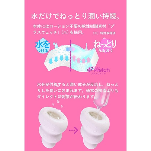 特許登録済独自素材プラスウェッチは水をつけて軽く擦ることで、内部の超ミクロサイズで閉じ込められた潤いゼリーが水に反応し、沁みだし、樹脂表面をねっとりと潤い包みこみます。スジ・イボ・ヒダの多彩な刺激が楽しめます。