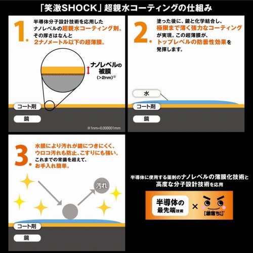 半導体技術により、薄く強力なコーティングが実現。コーティングに水膜ができ、鏡のくもり、ウロコ汚れを防止。
