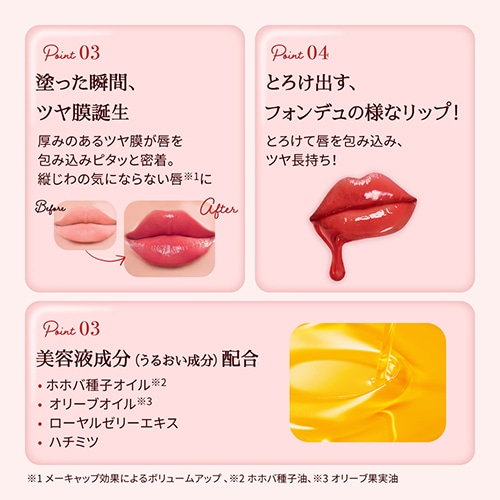 美容液オイルのようなとてもわらかいリップスティックを守るダイヤルロック容器を採用しており、うるおうぷっくりとした粘膜カラー