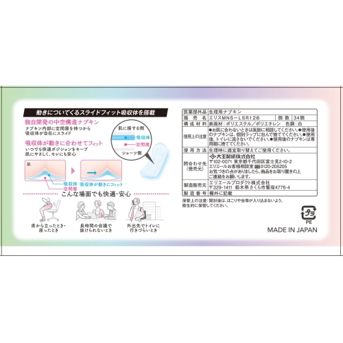 ●動きについてくる「スライドフィット吸収体」 ナプキン内部に空間層を持つから吸収体が自在にスライド。身体の動きについてくるから肌とのスキマができにくく、ナプキンのズレ・ヨレを低減。経血もしっかりキャッチ。