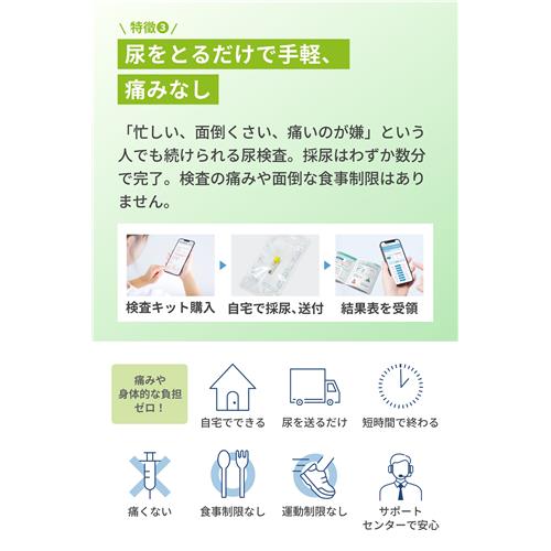 ◆自宅で簡単にできる尿検査。採尿はわずか数分で完了。
