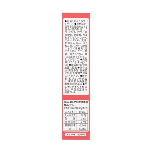 材質・原材料・成分 乳等を主要原料とする食品(国内製造)、クリーミングパウダー、脱脂粉乳、乾燥鮭、たまねぎエキスパウダー、チキンパウダー、食塩、乾燥にんじん、ほうれん草パウダー、酵母エキス/増粘剤(加工でん粉)、クエン酸第一鉄ナトリウム、酸化防止剤( ビタミンE、ビタミンC)