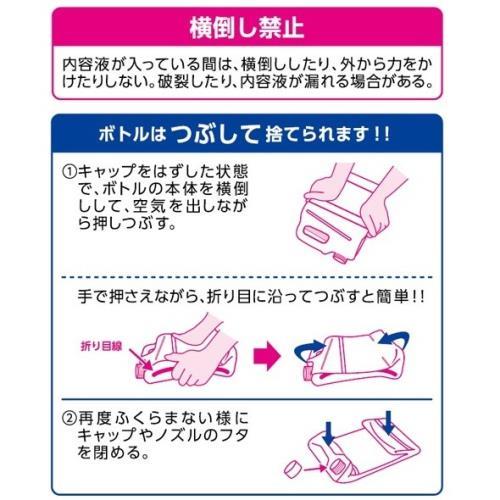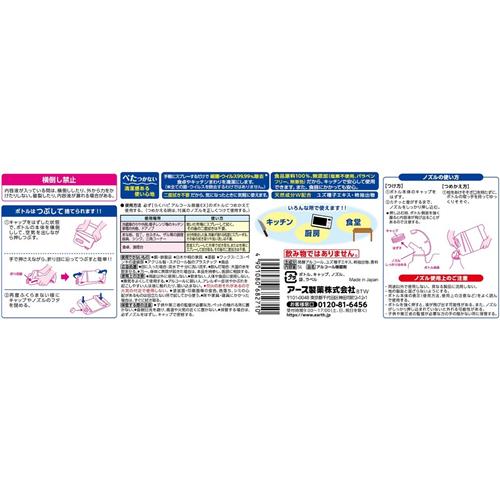 【使用場所と使い方】 ●冷蔵庫の中や外側、電子レンジ等のキッチン家電の外側、ドアノブ:乾いた布等にスプレーして拭く。その後の二度拭きは不要。 ●まな板、包丁、台ふきん、ザル等の調理器具、シンク、三角コーナー:水分を除去した後、対象が濡れる程度にスプレーする。その後の拭き取りや洗い流しは不要。 ●食卓、調理台:直接スプレーして、布等で拭き取る。または布等にスプレーして拭き取る。その後の二度拭きは不要。 【使用できないもの】 ●銅・鉄製品●白木や桐の家具●漆器●ワックス・ニス・ペンキの塗装部●アクリル製・スチロール製のプラスチック●食品 【ノズルの使い方】 ●つけ方 (1)ボトル本体のキャップをはずす。 (2)カチッと音がするまで、ノズルをしっかり押し込む。 ※押し込む時、ボトル側面を強く握ると内容液が飛び出ることがあるので注意する。 ●つめかえ方 (1)栓をあけ注ぎ口を持たずに、ボトルの取っ手を持ってゆっくりそそぐ。 【横倒し禁止】 ●内容液が入っている間は、横倒ししたり、外から力をかけたりしない。破裂したり、内容液が漏れる場合がある。 【ボトルはつぶして捨てられます】 (1)キャップをはずした状態で、ボトルの本体を横倒しして、空気を出しながら押しつぶす。手で押さえながら、折り目に沿ってつぶすと簡単。(2)再度ふくらまない様にキャップやノズルのフタを閉める。◆本品記載の使用法・使用上の注意をよくお読みの上ご使用下さい。