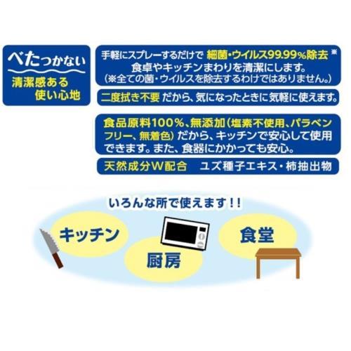 ●食卓、調理台:直接スプレーして、布等で拭き取る。または布等にスプレーして拭き取る。その後の二度拭きは不要。 【使用できないもの】