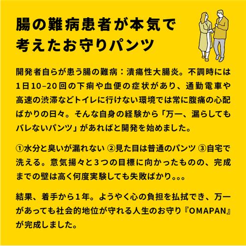 ◆OMAPANの開発者は、24才で腸の難病「潰瘍性大腸炎」を発症。不調時には1日10-20回の下痢や血便に悩まされ、外出先では常にトイレを探す日々。その経験をもとに「たとえ漏らしても気付かれないパンツを作りたい」「同じ病の方々にも安心して外出できる社会を創りたい」そんな想いから開発に着手。