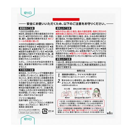 2) 目や目のまわりに湿疹、かぶれ等が現れた場合、赤み、かゆみ等の異常が続く場合は、その後の使用を中止し、医師に相談する ※肌が温まると、一時的に肌が赤くなることや、かゆみを感じることがある