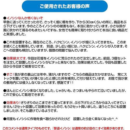 ※注意2:設置場所や天災・豪雨等の極端な気象条件化においては、十分な忌避効果が現れない場合があります。