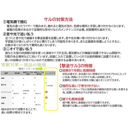 ・サルが嫌いな臭いで寄せ付けない!・結束バンドやヒモなどで簡単取付け!・効果時間は驚きの1年間!簡単設置でサルを寄せ付けない