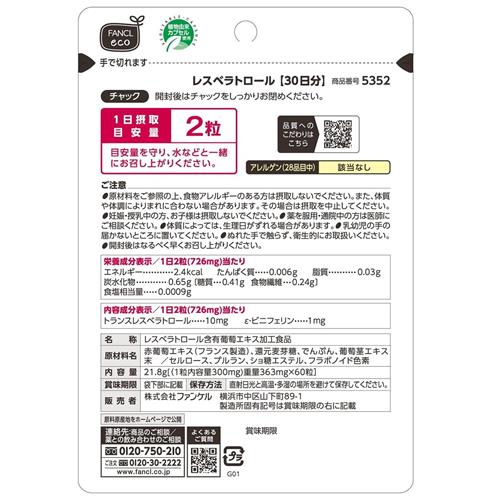 栄養成分:1日2粒(726mg)当たり エネルギー:2.4kcal、たんぱく質:0.006g、脂質:0.03g、炭水化物:0.65g(糖質:0.41g、食物繊維:0.24g)、食塩相当量:0.0009g 内容成分表示 トランスレスベラトロール:10mg、ε-ビニフェリン:1mg