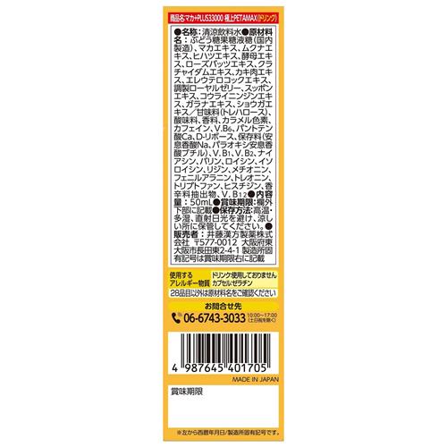 ぶどう糖果糖液糖(国内製造)、マカエキス、ムクナエキス、ヒハツエキス、酵母エキス、ローズバッツエキス、クラチャイダムエキス、カキ肉エキス、エレウテロコックエキス、調製ローヤルゼリー、スッポンエキス、コウライニンジンエキス、ガラナエキス、ショウガエキス/甘味料(トレハロース)、酸味料、香料、カラメル色素、カフェイン、V.B6、パントテン酸Ca、D-リボース、保存料(安息香酸Na、パラオキシ安息香酸ブチル)、V.B1、V.B2、ナイアシン、バリン、ロイシン、イソロイシン、リジン、メチオニン、フェニルアラニン、トレオニン、トリプトファン、ヒスチジン、香辛料抽出物、V.B12