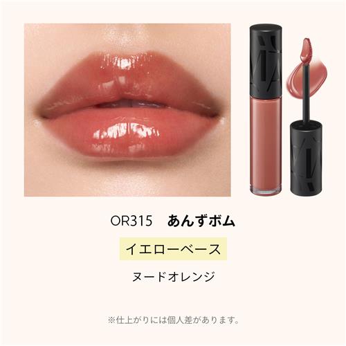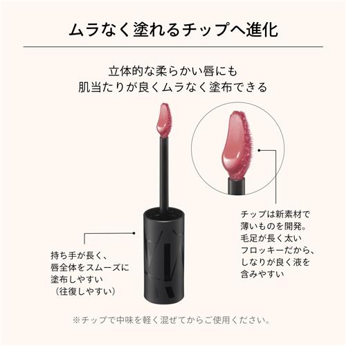 ●つけたての発色をキープしながら透明度の高いツヤがあふれ出し唇をまるごと包み込む。