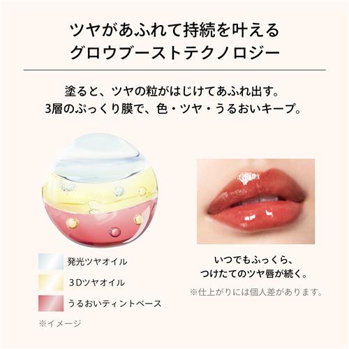 ●つけたての発色をキープしながら透明度の高いツヤがあふれ出し唇をまるごと包み込む。