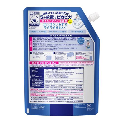 逆さで使える機構上、スプレーをはずすときにチューブの先端やキャップの裏側から液がたれることがあります。液がたれても影響の少ない場所で作業してください。 ●パックを強く持つと、液が飛び出ることがあるので注意する。 ●他の洗剤とまぜない。 ●必ず「トイレマジックリン こすらずスッキリ泡パック ウォーターミントの香り」のボトルにつめかえる。 ●ボトル(300 ml)に一度に全量は入りません。 ●液モレすることがあるので、つめかえ後は必ずキャップを閉めて立てて保管する。 ●この商品をつめかえずにそのまま使用しない。