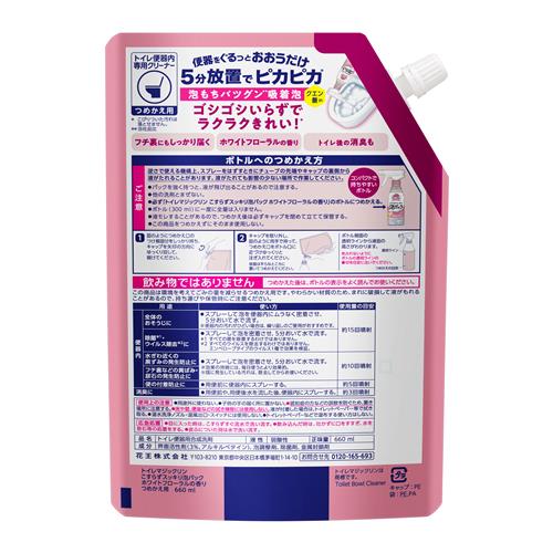 ●パックを強く持つと、液が飛び出ることがあるので注意する。 ●他の洗剤とまぜない。 ●必ず「トイレマジックリン こすらずスッキリ泡パック ホワイトフローラルの香り」のボトルにつめかえる。 ●ボトル(300 ml)に一度に全量は入りません。 ●液モレすることがあるので、つめかえ後は必ずキャップを閉めて立てて保管する。 ●この商品をつめかえずにそのまま使用しない。