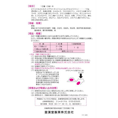 ●主成分のビサコジルが、大腸の粘膜を刺激して腸のぜん動運動を活発にし、また排便反射を刺激して排便を促進します。