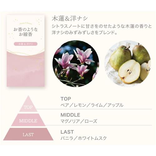 ●シトラスノートに甘さをのせたような木蓮の香りと洋ナシのみずみずしさをブレンドした上質なお線香です。
