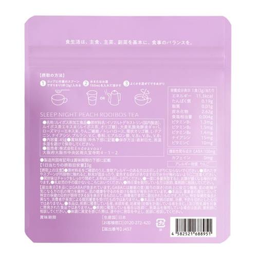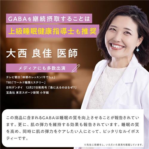 栄養成分:イソマルトデキストリン(国内製造)、ルイボス茶エキス末(ルイボス茶、オリゴ糖)、大麦乳酸発酵液ギャバ、ローズマリーエキス末、りんご繊維/トレハロース、環状オリゴ糖、L-テアニン、ナイアシン、プルラン、V.C、香料、ヒアルロン酸、V.B2、V.B6、V.B1