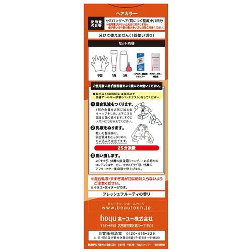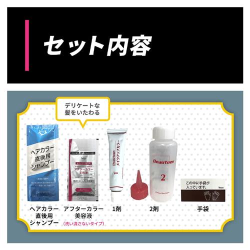 有効成分:5-アミノオルトクレゾール、1-ヒドロキシエチル-4、5-ジアミノピラゾール硫酸塩 その他の成分:HEDTA・3Na2水塩、PG、POEオレイルエーテル、POE・ジメチコン共重合体、POEステアリルエーテル、POEベヘニルエーテル、アスコルビン酸、強アンモニア水、高重合PEG、ステアリルアルコール、ステアリン酸、ステアルトリモニウムクロリド、セタノール、タウリン、ツバキ油、テアニン、ヒマワリ油-1、ポリ塩化ジメチルジメチレンピロリジニウム液、無水亜硫酸Na、モノエタノールアミン、香料