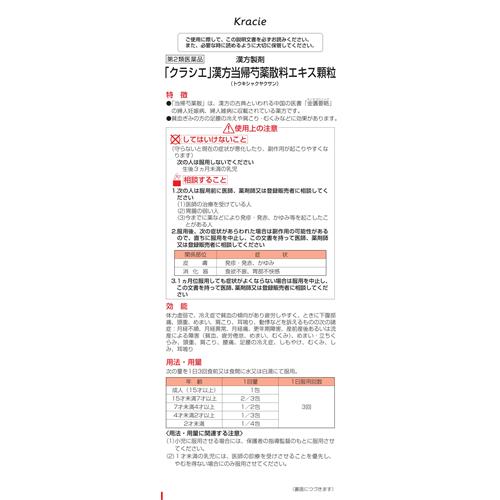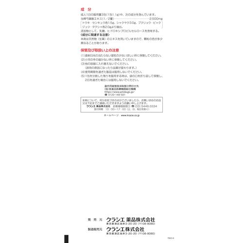 3包(1包1.1g)中 成分 分量 内訳 当帰芍薬散エキス(1/2量) 2500mg (トウキ・センキュウ各1.5gシャクヤク3.0gブクリョウ・ビャクジュツ・タクシャ各2.0gより抽出。)添加物として乳糖、ヒドロキシプロピルセルロースを含有する。<成分に関連する注意>本剤は天然物(生薬)のエキスを用いていますので、顆粒の色が多少異なることがあります。