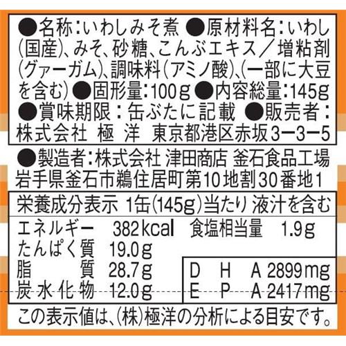 いわし(国産)、みそ、砂糖、こんぶエキス/増粘剤(グァーガム)、調味料(アミノ酸)、(一部に大豆を含む)